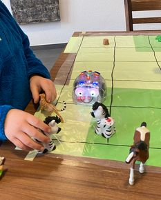 Besonders viel Freude bereitete eine Schatzsuche, bei der die Roboter gezielt zum Ziel programmiert wurden. Später entstanden mit Playmobil und Figuren eigene kleine Landschaften, durch die die Blue Bots ihren Weg fanden.